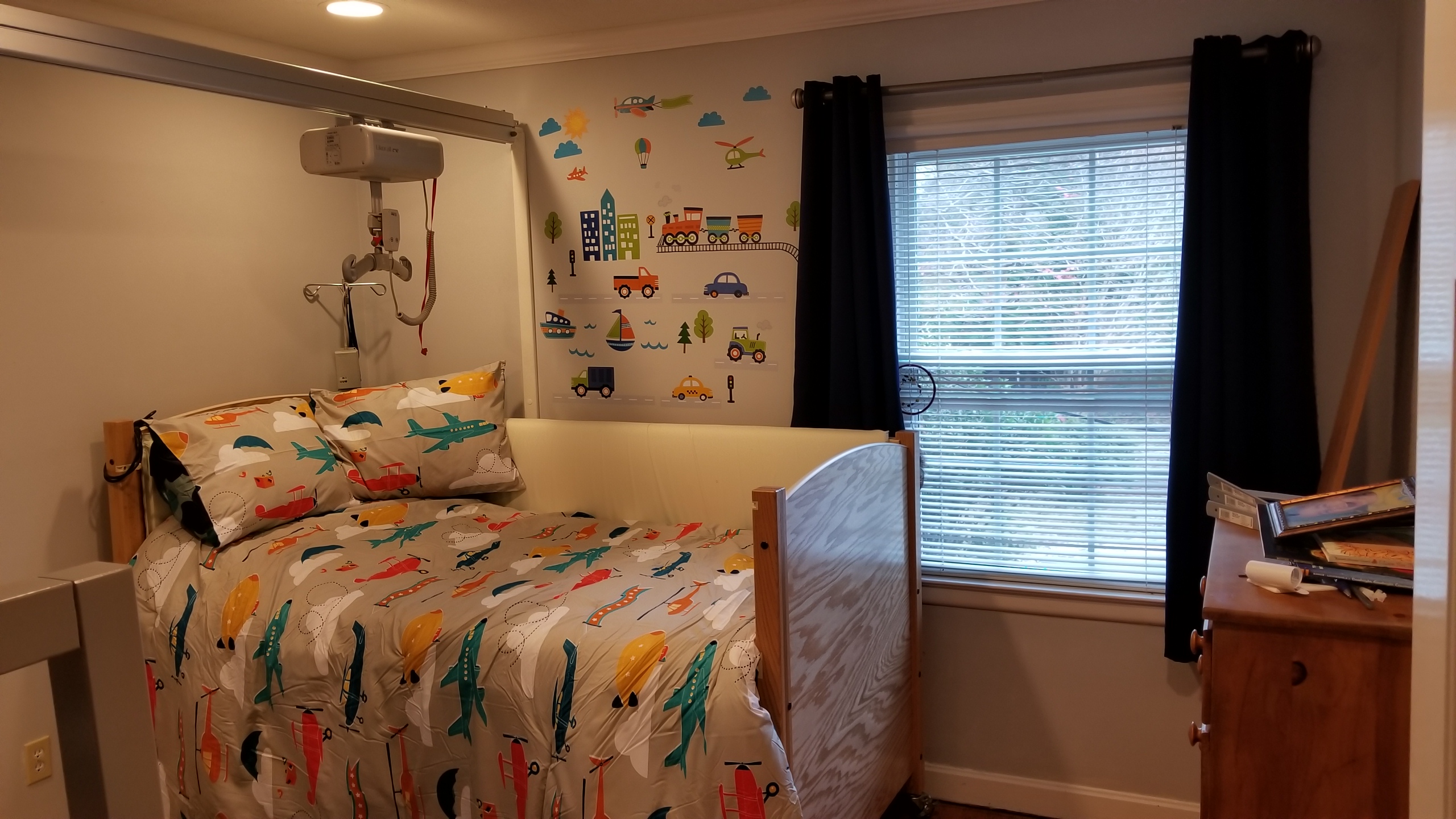 Aaron shared a bedroom with another family member, but the space wasn’t ideal for him and his condition. The family needed a way to easily transfer him from a safer bed to his wheelchair, and then easily get him to the bathroom. He also needed a fun space that was truly his own.