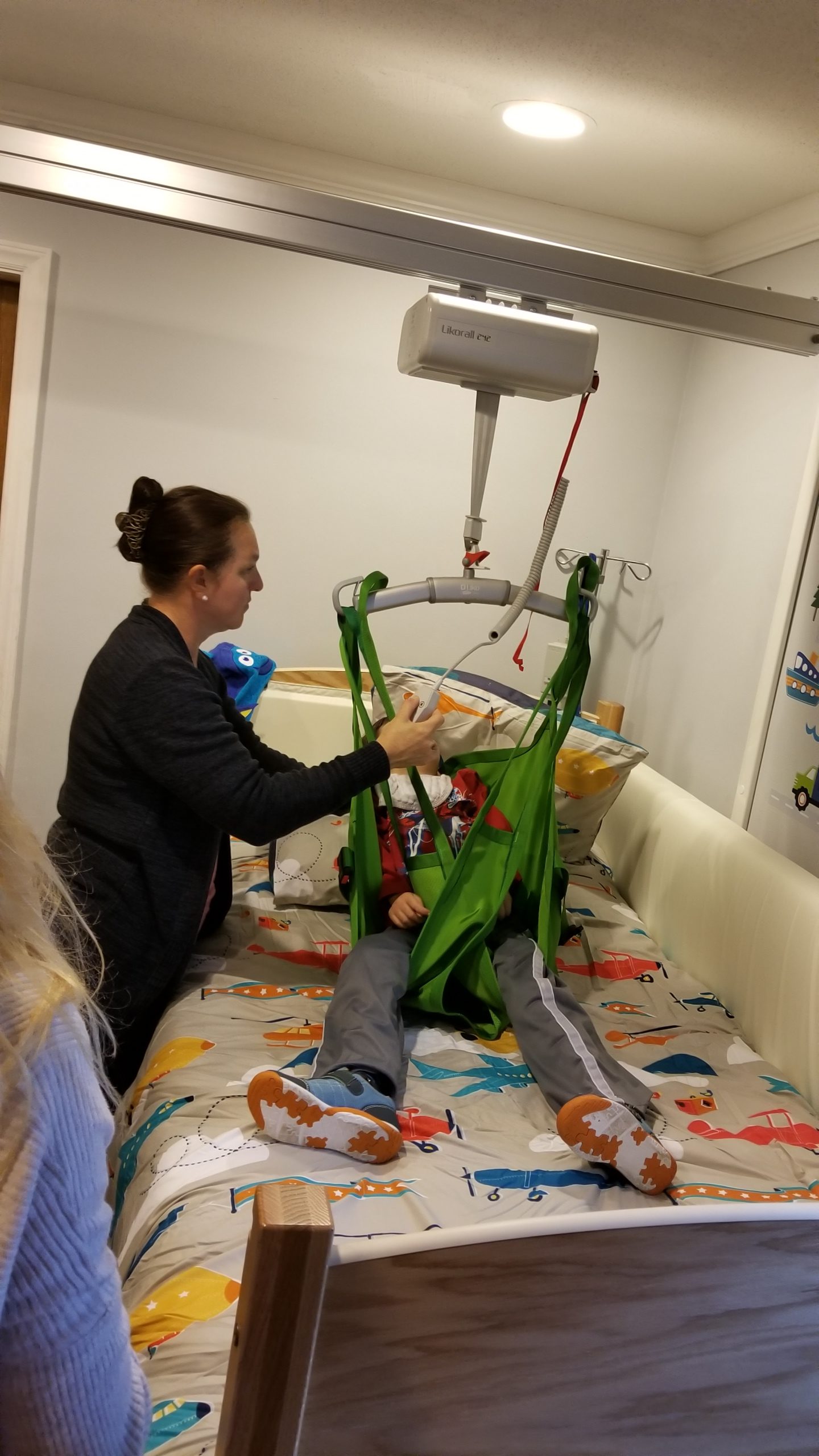 With the help of funding from CAP-C services and Aaron’s grandparents, Welcome Home Angel was able to help give Aaron a much safer place in which to sleep, play, and live. With his new, safe bed, and new lift with tracking system, Aaron’s grandparents can now easily transfer him from bed to wheelchair, and from wheelchair to bed. The track also allows them to transfer him into the bathroom next door with ease. And lastly, Welcome Home Angel was able to provide Aaron with a swing set outside, with a special swing, just for him, so he can play outside with his family!