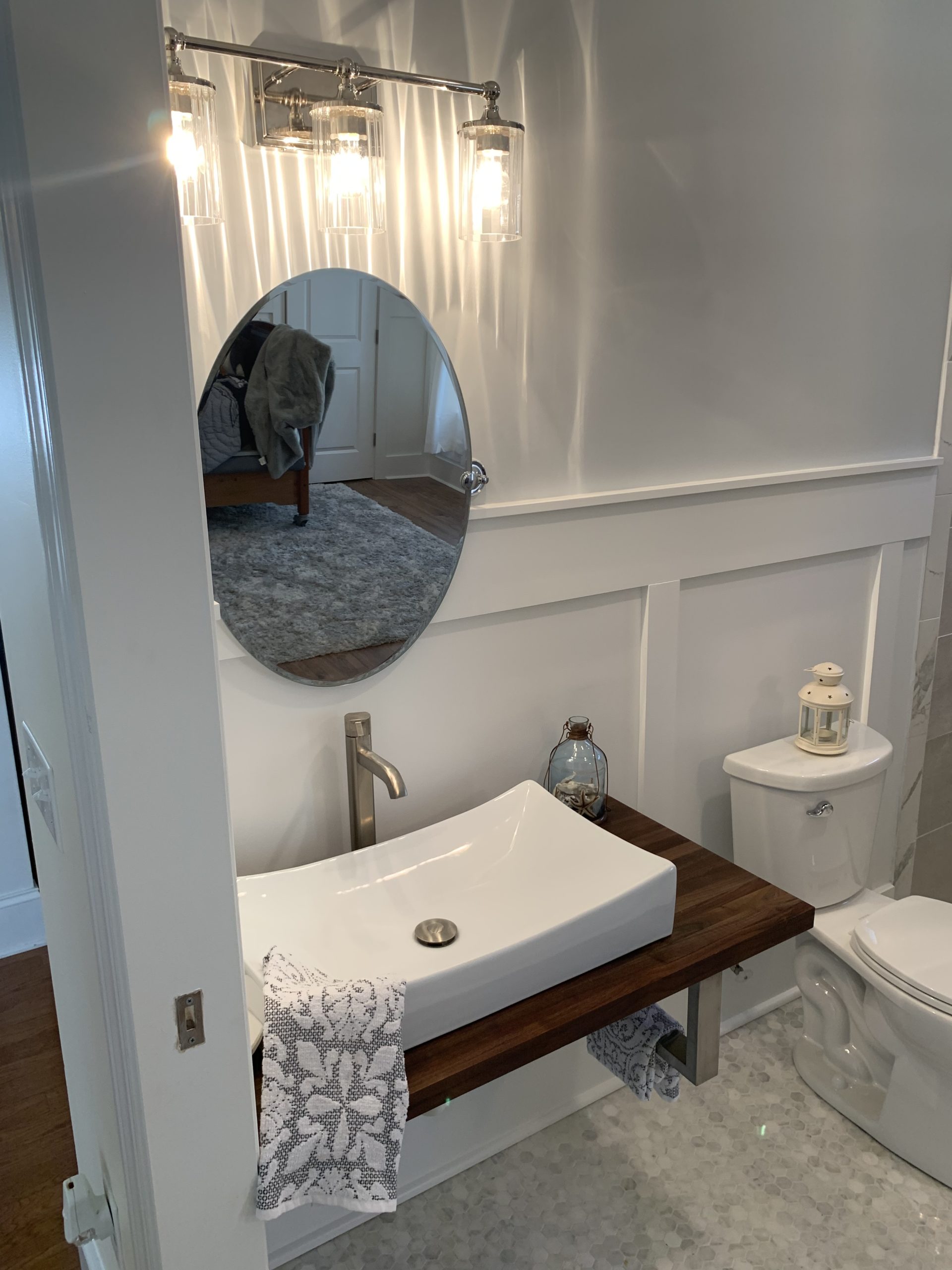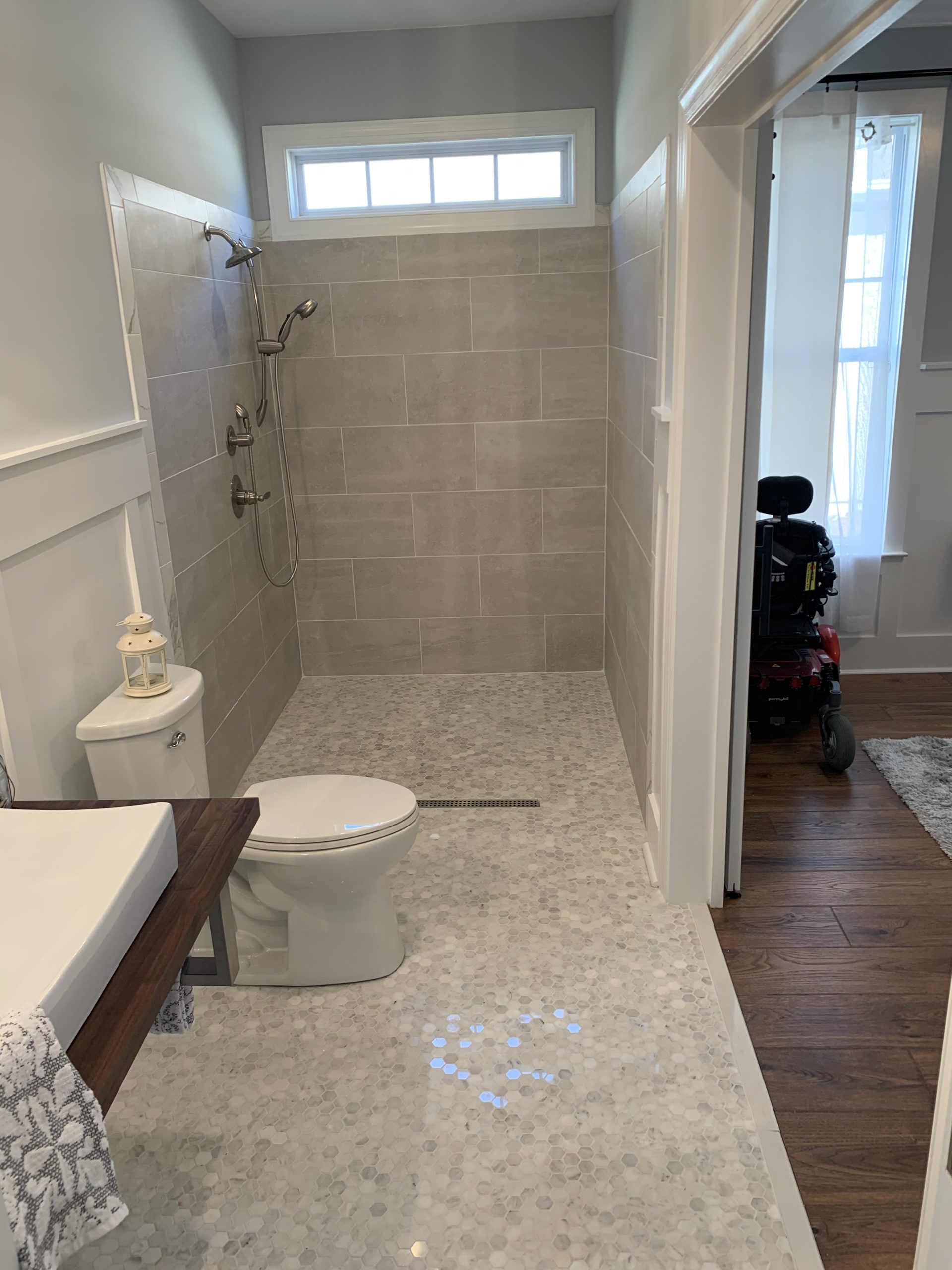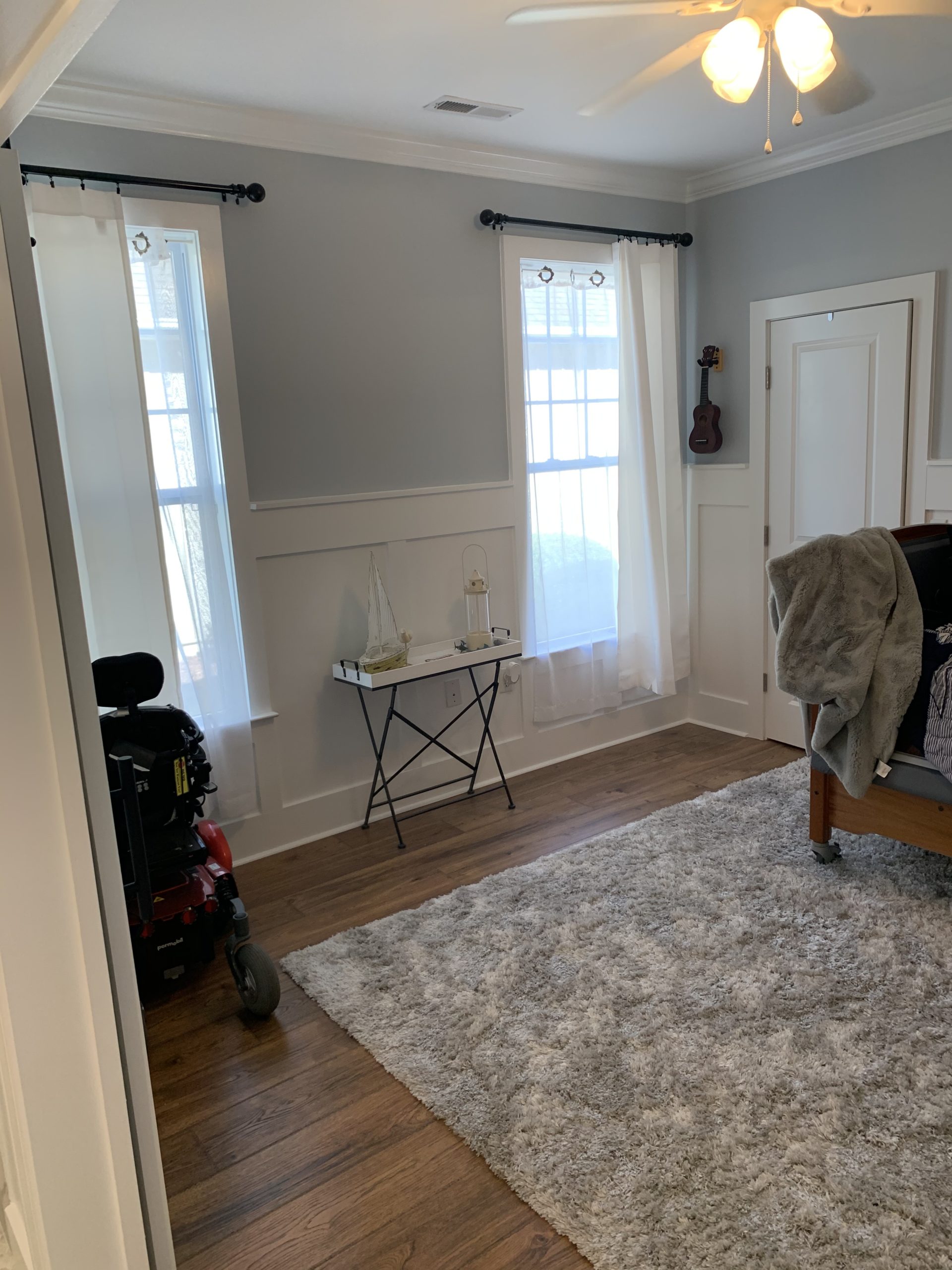 The new design brought in a calming sea theme through and incorporated hardwood floors, a custom closet organization system, and freshly painted walls with wainscoting around the bottom half of the walls to maintain the integrity of the walls from the many wheelies John does in his wheelchair! The custom closet organization system was designed for storage of John’s toiletry items, medical supplies, and medical equipment. We also provided John with a hammock swing for him to relax in.