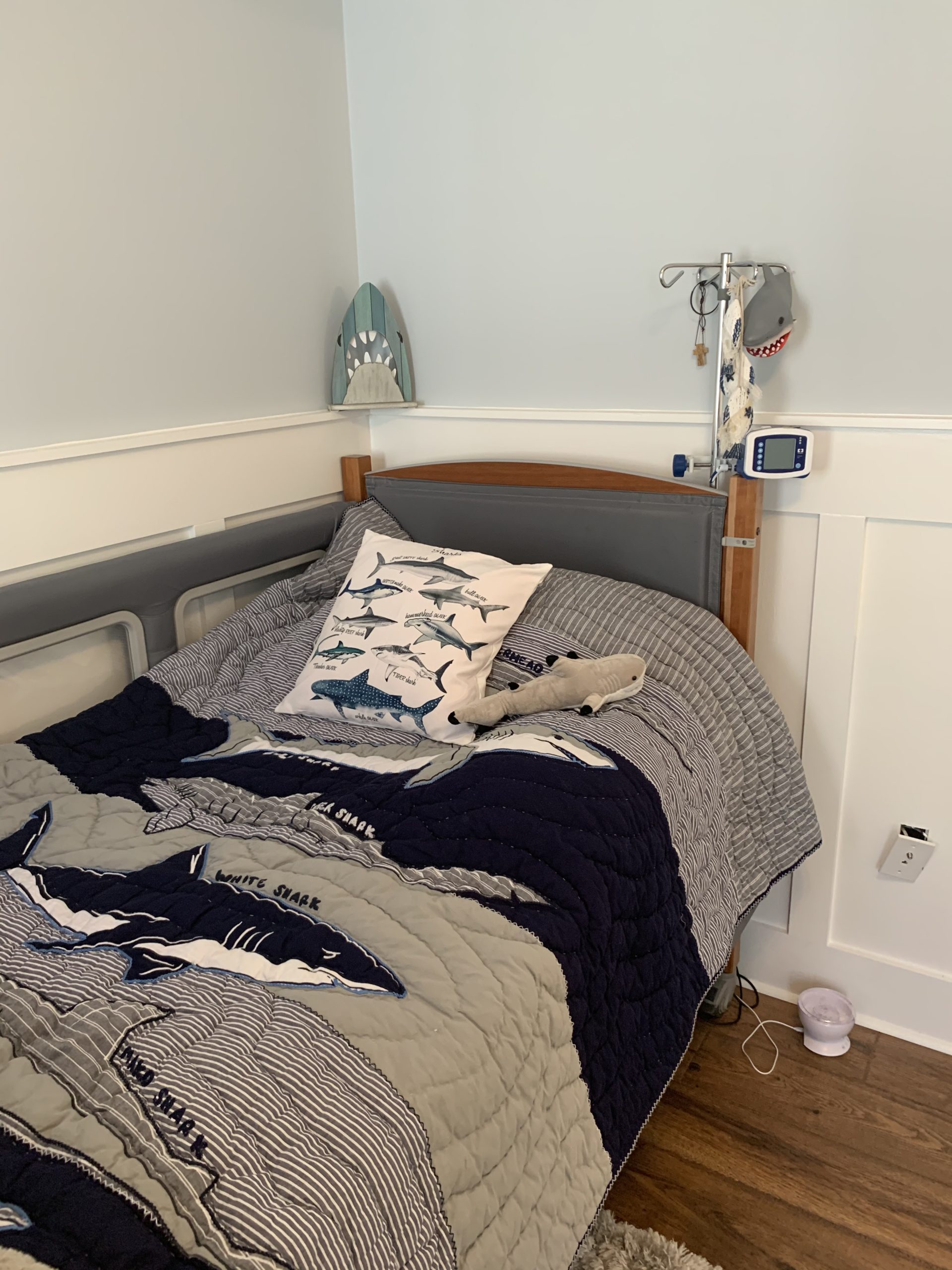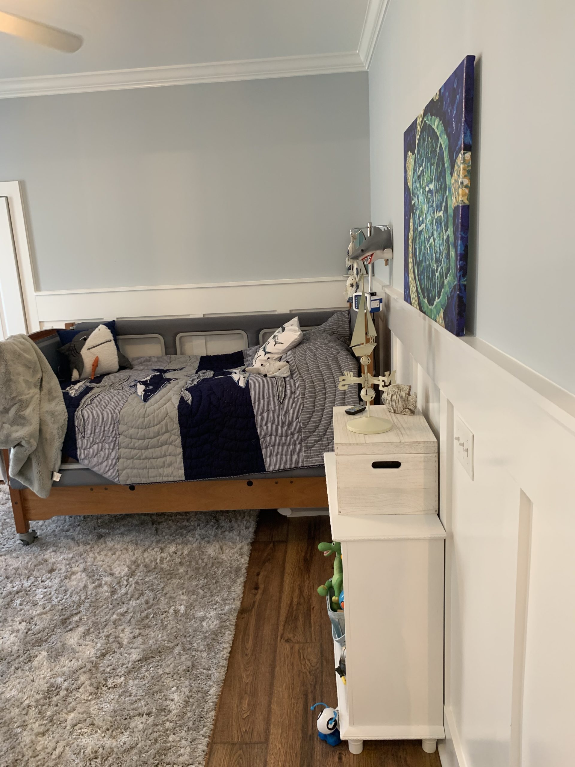 John is an adorable 8 year old boy who loves sharks and has a twin sister, Chloe, who loves mermaids – let the sea themed makeover begin! John was diagnosed with Cerebral Palsy, Spastic Paraplegia, and a Complex Seizure Disorder. He requires constant care and needs more solutions in his current bedroom. John and Chloe were sharing a bedroom with the family, planning to eventually move John into his own space- the unfinished master suite. The room needed hard floors to allow for ease of wheelchair accessibility and an ample amount of storage solutions.