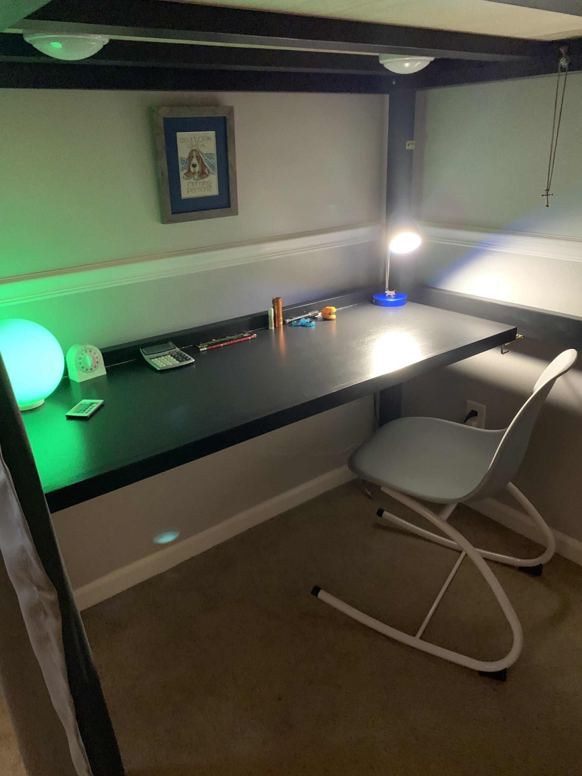 Payton was so thrilled with how his room turned out! The design team from Live Oak Bank worked really hard to make his dream bedroom a reality. Payton wanted a dark room, with a lot of closed in spaces to give him that sensory stimulation he so much desires. We worked with Blue Moon Beds to build a custom loft bed with a wall closing in the top, bed area. They built a shelf unit and desk in the bottom area of the bed for Payton to have a home work space. Payton wanted barn doors to close in the bottom area, but for safety reasons we were unable to make that happen, so instead we added a curtain to still give him the closed in feeling he was wanting! We were able to use the spare bedroom to make it a sensory room for Payton. His parents built a rock wall on one of the walls, and we moved his TV and gaming systems into the sensory room so his bedroom would be strictly for sleeping and calming activities.