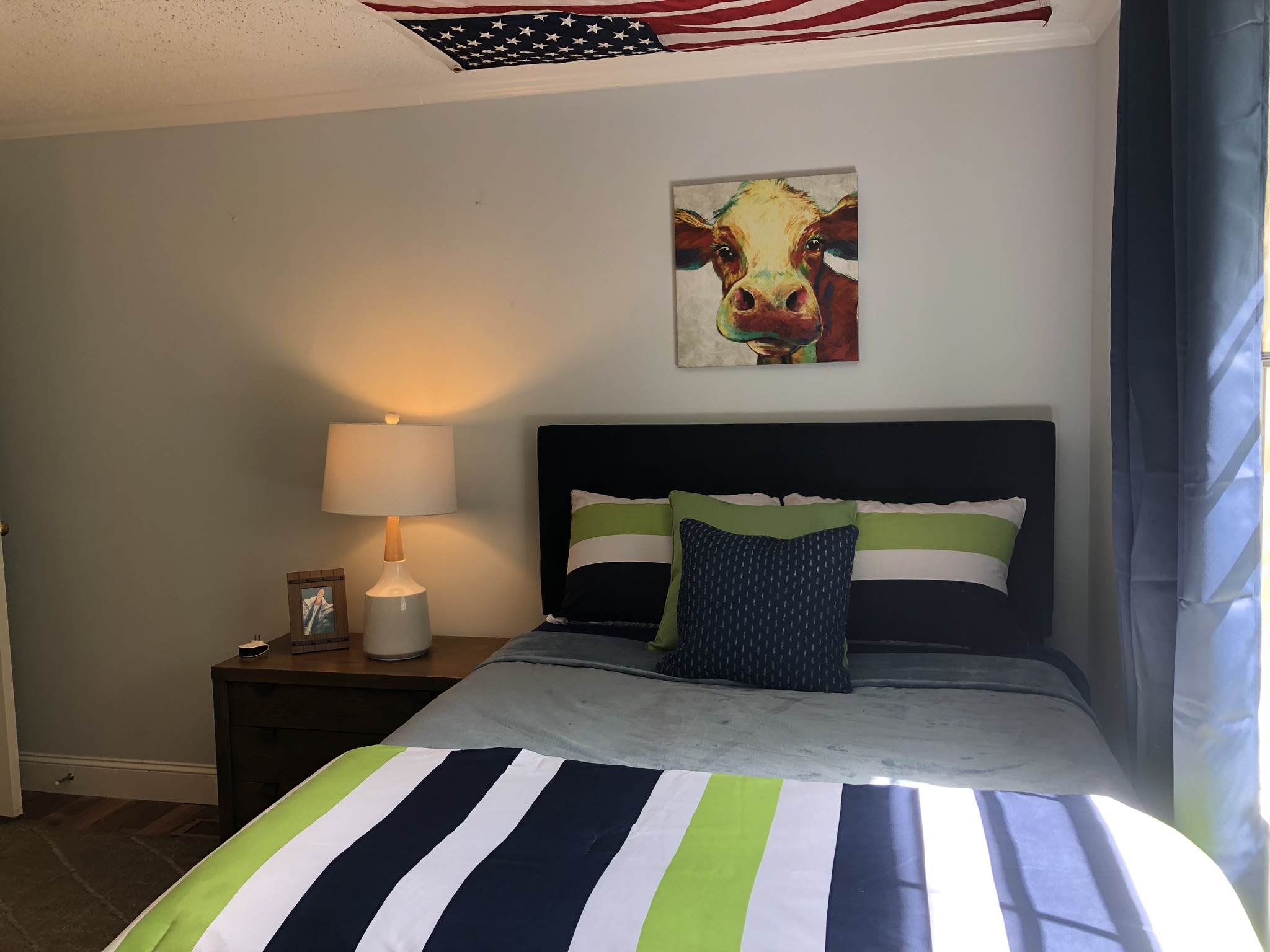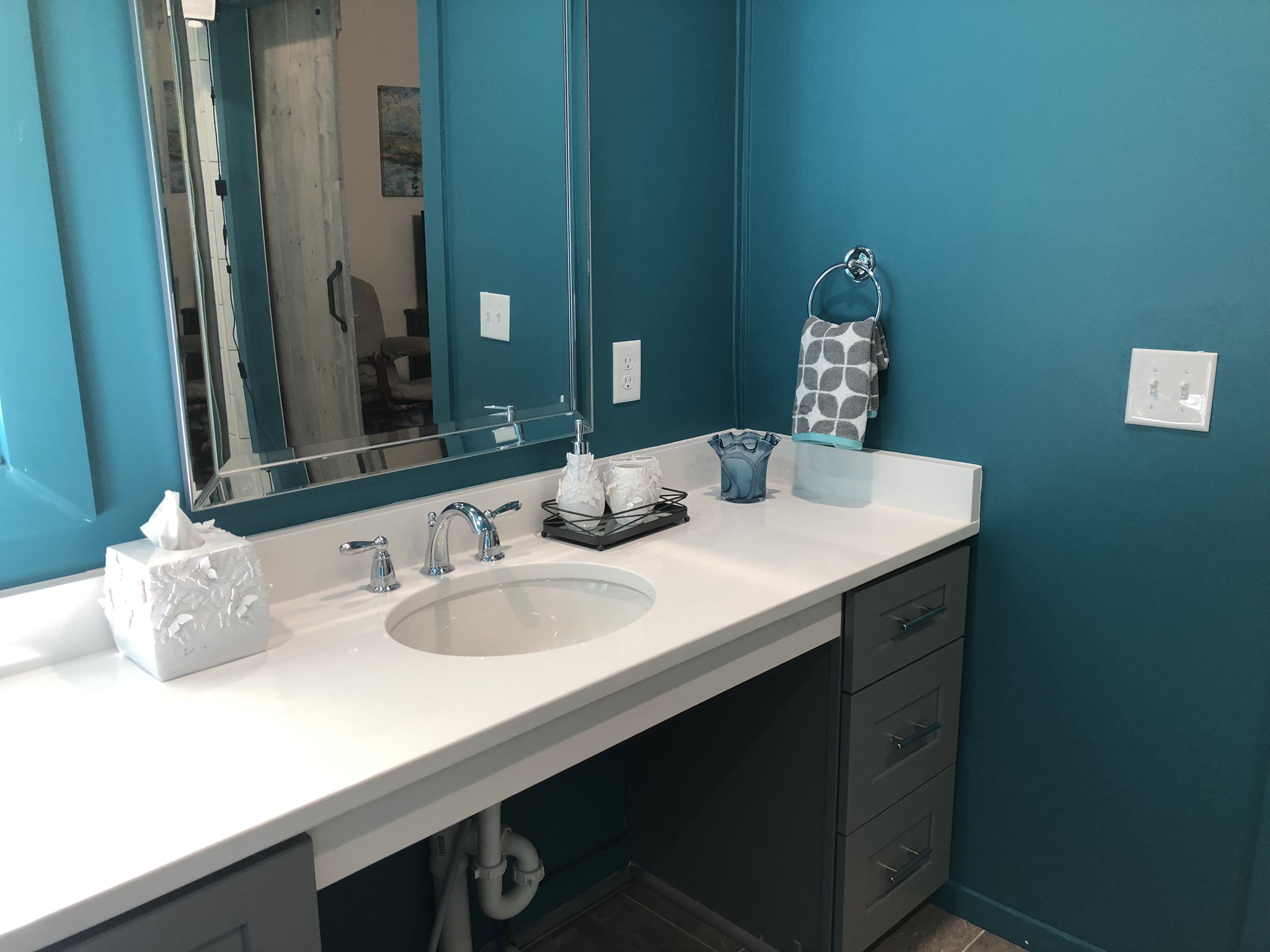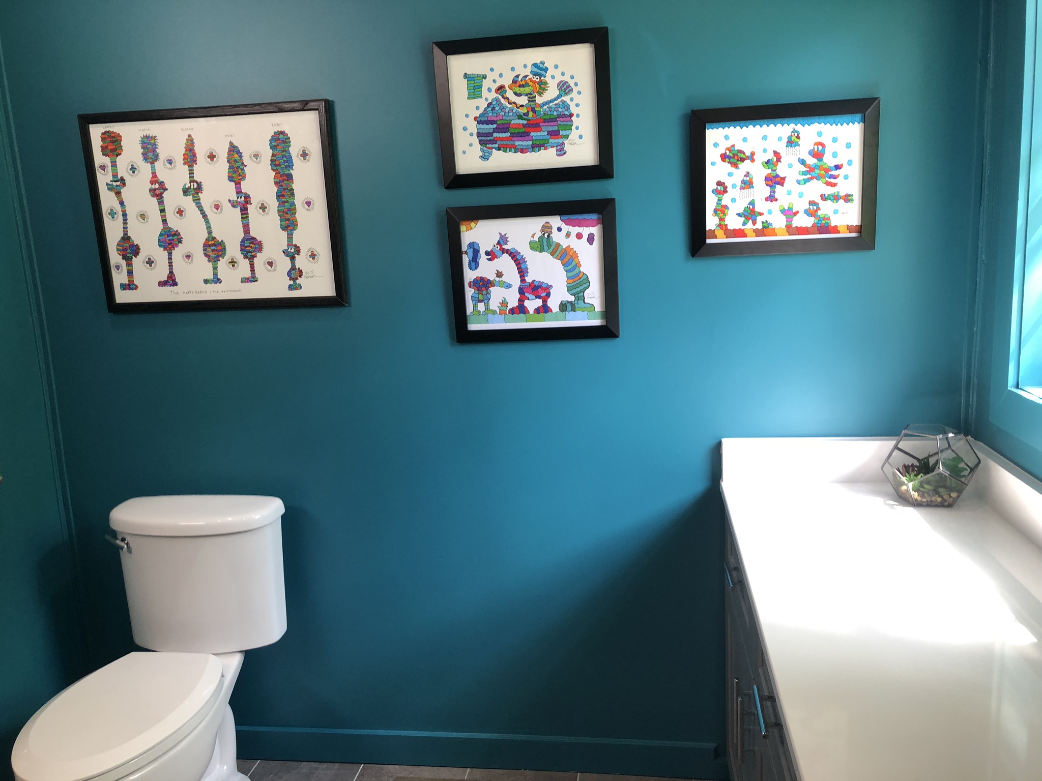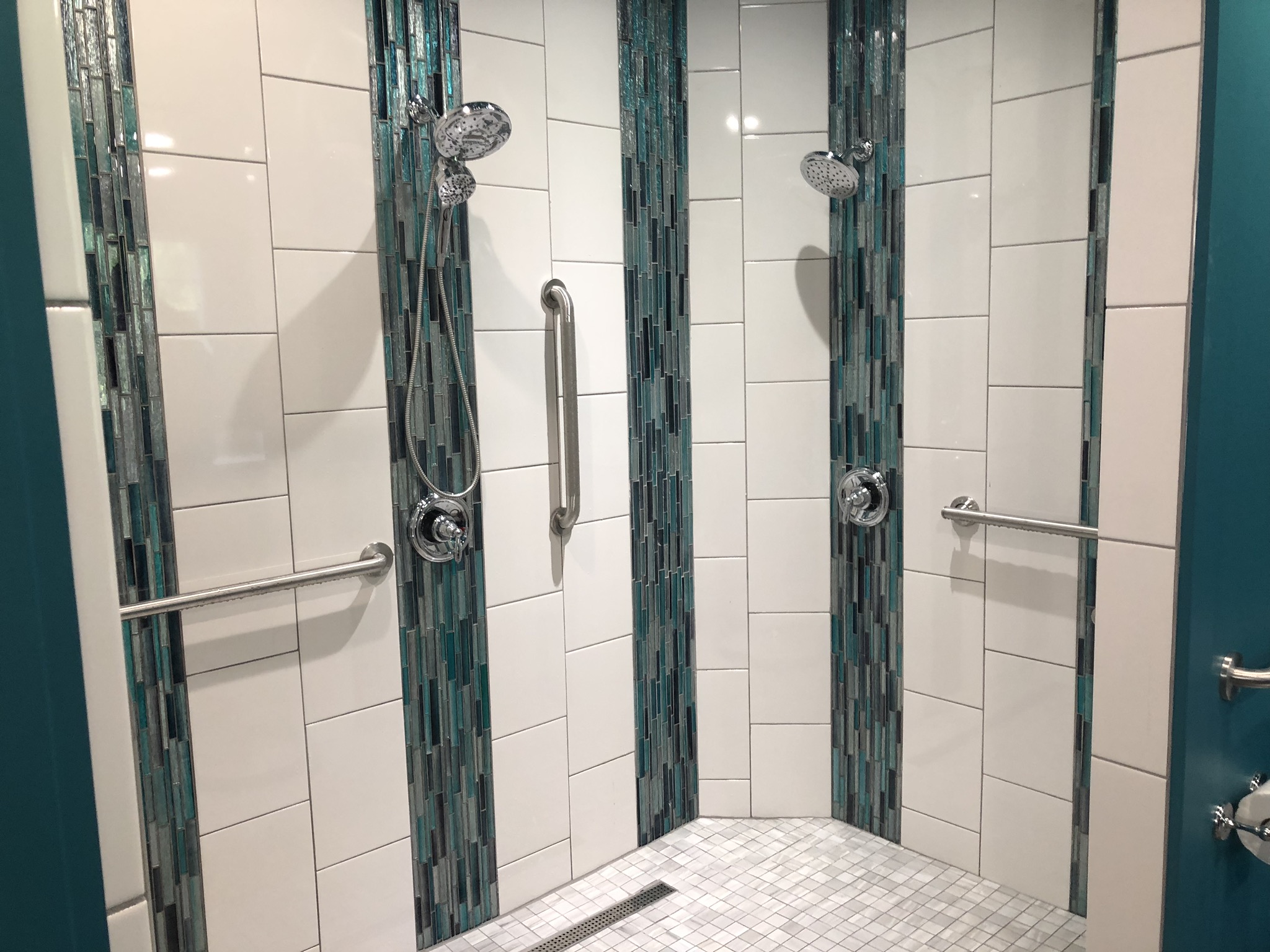 The master bathroom would not have happened with out help from Bryant Bass and his team at Bass Built Homes, Brian Driscoll from DCOTA construction and his paint crew, and Meg Caswell’s interior design eye to transform this bathroom into an amazing space! They opened up the bathroom to have a large walk-in/roll-in shower, with beautiful teal tile work, a teal ceiling and teal walls (the mom’s favorite color), and some phenomenal art work from DJ Svoboda and the Imagifriends.